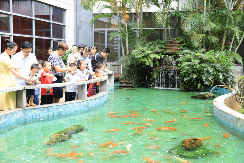 黃的、白的、黑的魚兒在水里游來游去,時不時悄悄冒出水面吐一個夢幻般的空氣泡…..在參觀公司時,小朋友們來到了魚池邊,看到魚兒可興奮極了,并在爸爸媽媽的指導(dǎo)下給魚兒投食。