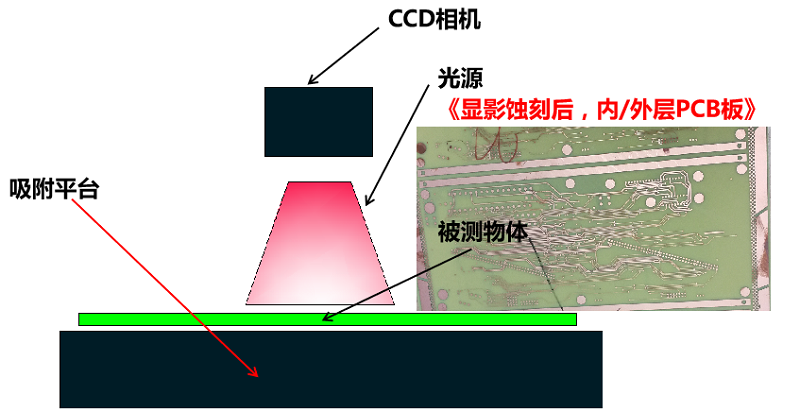 通過影像成像系統(tǒng)及光源從上表面垂直于被測板,呈顯影像(相機實時拍圖)感測,并將圖像傳送至電腦測量軟件,通過軟件測量工具分析圖像的“線寬/線距/線寬上下幅/圓/金手指線寬等”標(biāo)準(zhǔn)公差值對比,從而判斷被測板上的測量值OK或NG。