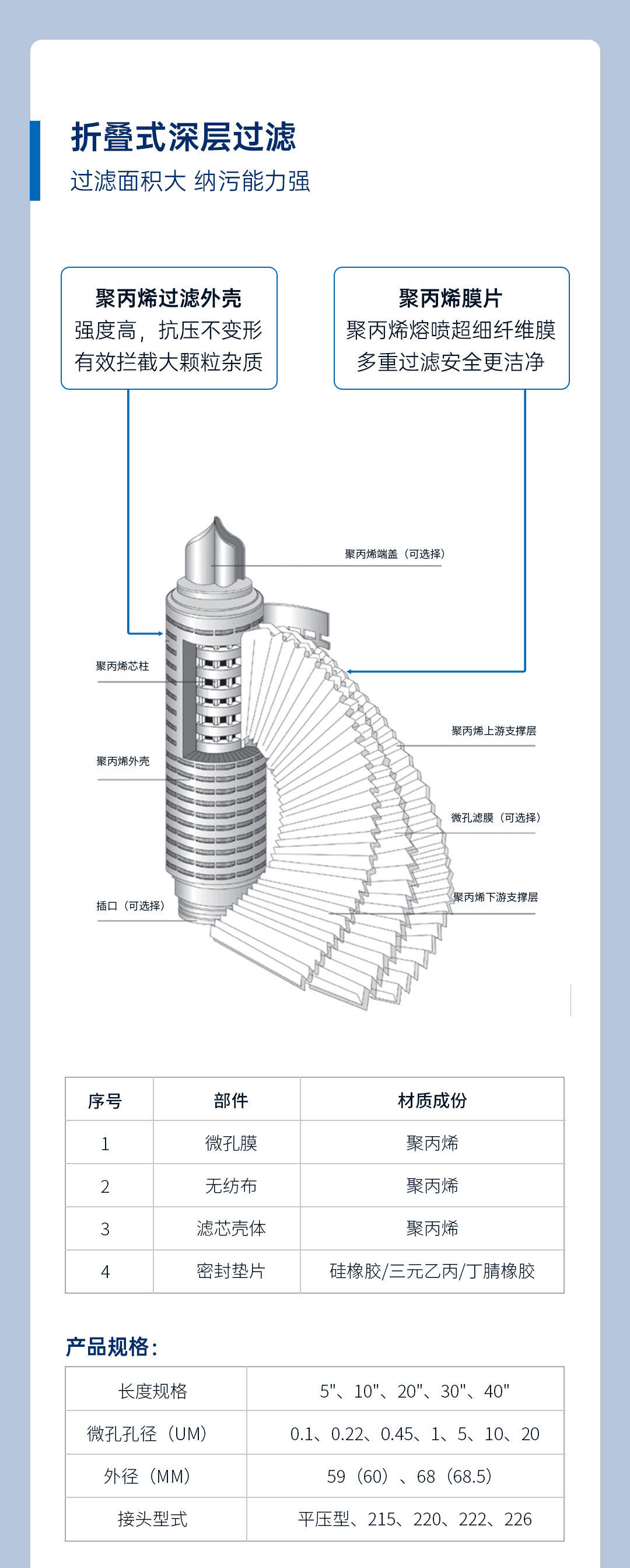 作為高過濾精度濾芯的折疊濾芯,在材質(zhì)上主要精選聚丙烯(PP)高分子微孔過濾膜材料,耐酸耐堿等化學相容性好;在生產(chǎn)工藝上,采用獨特的熱熔焊接加工技術,采用100%全新PP注塑成型塑料殼體,無任何粘合劑,無異物釋出。