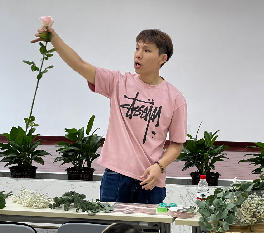 在老師的悉心指導(dǎo)下,大家大膽發(fā)揮自己的想象力,通過(guò)自己靈巧的雙手,將經(jīng)過(guò)修剪的多種花材,根據(jù)不同的色彩、形狀,有層次地搭配在一起。