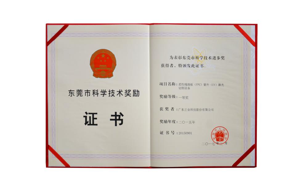 20173月,由東莞市政府頒發(fā),廣東正業(yè)科技股份有限公司(股票代碼:300410)榮獲東莞市科技進步一等獎,獲獎項目為“柔性線路板(FPC)紫外(UV)激光切割設備”。