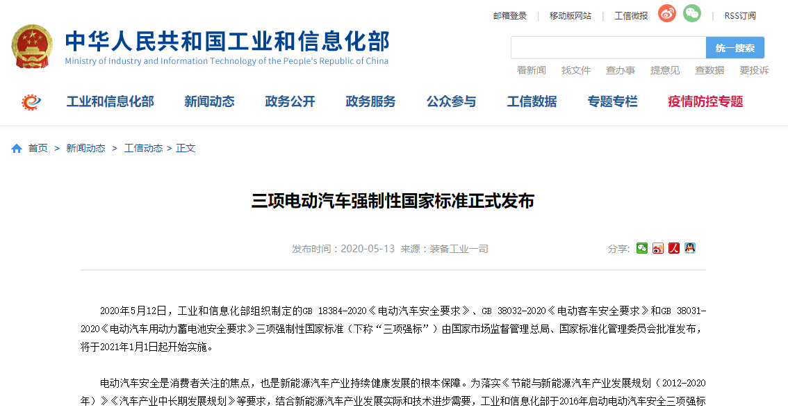 2020年5月12日,工業(yè)和信息化部組織制定的GB 18384-2020《電動汽車安全要求》、GB 38032-2020《電動客車安全要求》和GB 38031-2020《電動汽車用動力蓄電池安全要求》三項強制性國家標(biāo)準(zhǔn)由國家市場監(jiān)督管理總局、國家標(biāo)準(zhǔn)化管理委員會批準(zhǔn)發(fā)布,進一步提高和優(yōu)化了對電動汽車整車和動力電池產(chǎn)品的安全技術(shù)要求。