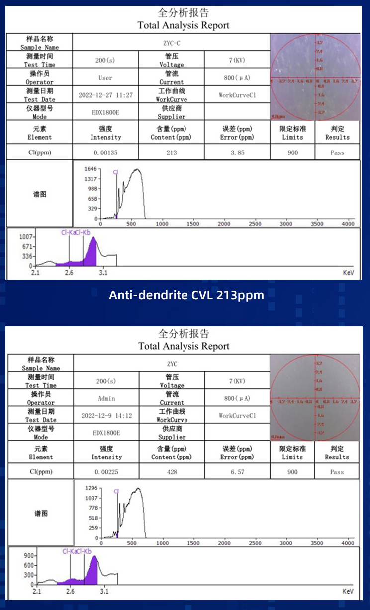 Anti-dendrite產(chǎn)品具有較Normal產(chǎn)品更低的鹵素水準(zhǔn),更耐離子遷移。