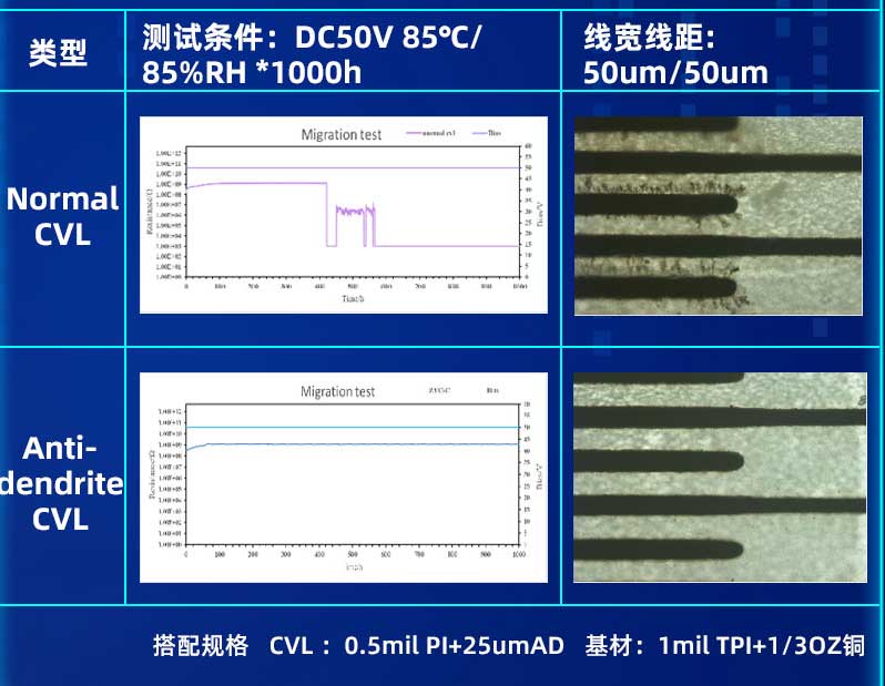 提高PCB基材的耐離子遷移性成為了電子產(chǎn)品開發(fā)中的迫切需求。因此,對于精細(xì)線路制程工藝,與之匹配的抗枝晶(Anti-dendrite)材料就顯得十分必要??怪Вˋnti-dendrite)材料的使用,能有效降低細(xì)線路間產(chǎn)生枝晶的風(fēng)險,提高FPC的可靠性。